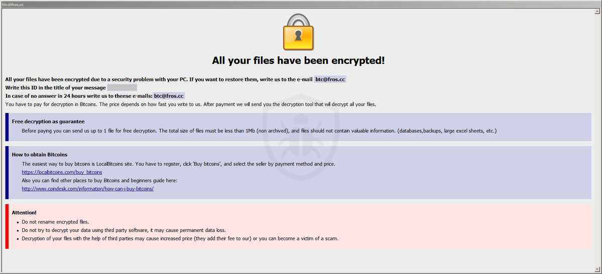 The ransomware uses a text file that contains a ransom note to detail what happened to the files on the machine and how to make a ransom payment to allegedly decrypt the files (the way the malware author wants you to). The ransomware uses the email address decrypt@fros.cc as a payment method. It should be noted that paying the ransom will not guarantee that you will recover your files or that the infection is removed and will not appear again in the future.