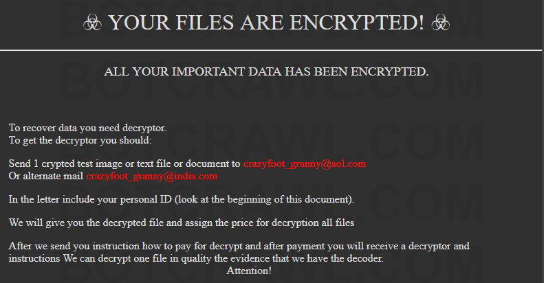 YOUR FILES ARE ENCRYPTED! ALL YOUR IMPORTANT DATA HAS BEEN ENCRYPTED. To recover data you need decryptor. To get the decryptor you should: Send 1 crypted test image or text file or document to crazyfoot_granny@aol.com Or alternate email crazyfoot_granny@india.com In the letter include your personal ID (look at the beginning of this document). We will give you the decrypted file and assign the price for decryption all files After we send you instruction how to pay for decrypt and after payment you will receive a decryptor and instructions We can decrypt one file in quality the evidence that we have the decoder. Attention!